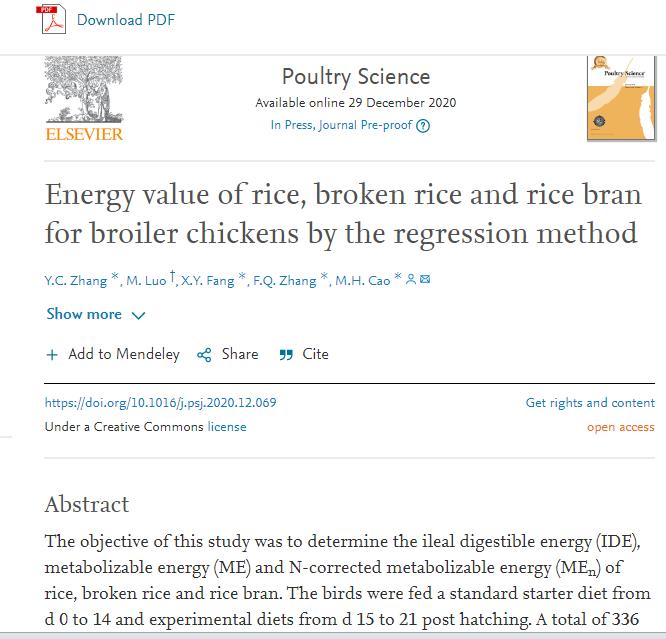 (Energy value of rice, broken rice and rice bran for broiler chickens by the regression method, Poultry Science, DOI: .org/10.1016/j.psj.2020.12.069;等比例回归法评定肉仔鸡对豆油、猪油、磷脂油和混合油能量的利用, 动物营养学报(2020,32(12):5692-5703)。