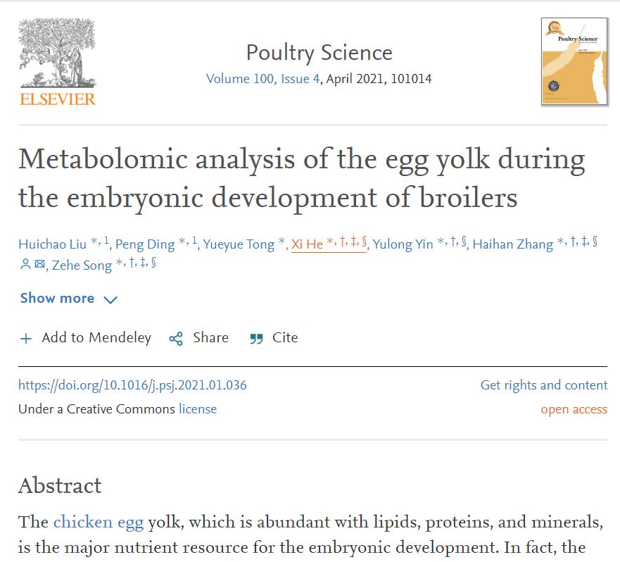 (Metabolomic analysis of the egg yolk during the embryonic development of broilers,DOI:https://doi.org/10.1016/j.psj.2021.01.036)